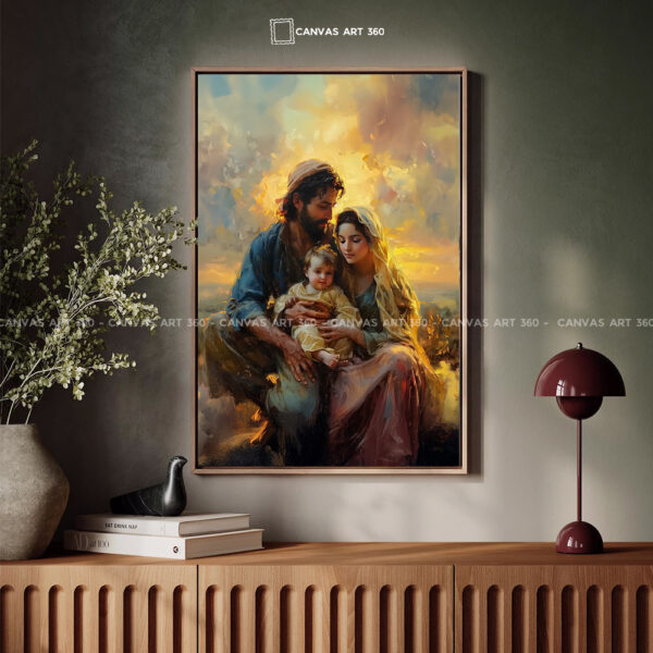 Bức tranh khắc họa hình ảnh Thánh Gia Thất (Đức Chúa Jesus, Đức Mẹ Maria và Thánh Cả Giuse) trong một phong cách nghệ thuật sơn dầu đương đại đầy ấn tượng. Thay vì những đường nét cổ điển nghiêm nghị, tác phẩm sử dụng những nhát cọ phóng khoáng, tạo nên sự chuyển động mềm mại giữa ánh sáng và màu sắc.