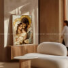 • Tone Vàng (Gold/Ochre): Không chỉ là màu sắc, nó đại diện cho ánh sáng và sự vĩnh cửu. Trong tranh, các vòng tròn vàng phía sau đầu nhân vật tạo ra tiêu điểm thị giác mạnh mẽ.